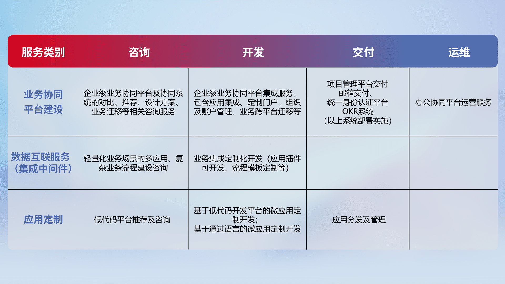 针对钉钉、、、企微、、、、IDaas等平台级产品提供产品的规划、、、方案、、交付、、定制化开发等服务,,实现如统一协同办公、、、、智能客户服务、、、、混合会议管理、、智能数据查询、、、等业务场景,,实现数字化转型。。。